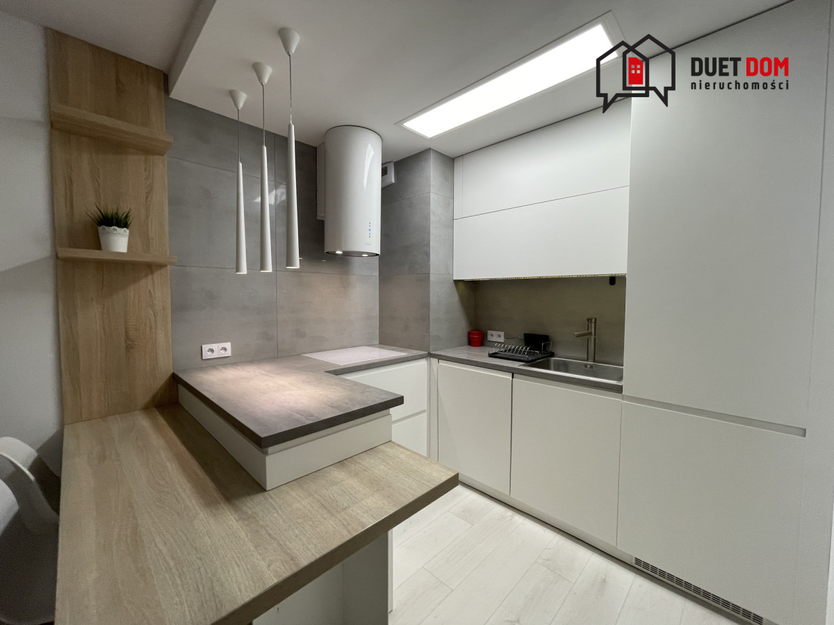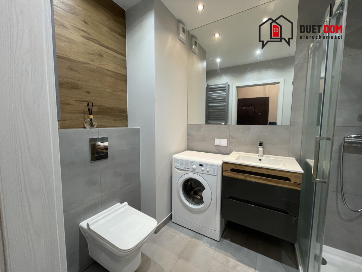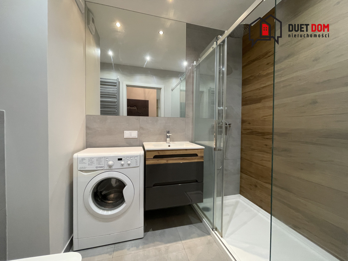Kuchnia wykonana na wymiar przez stolarza, w pełni wyposażona w sprzęt AGD: lodówkę z zamrażarką, piekarnik, płytę grzewczą, okap oraz zmywarkę. W łazience znajduje się pralka, prysznic oraz zabudowa z geberitem