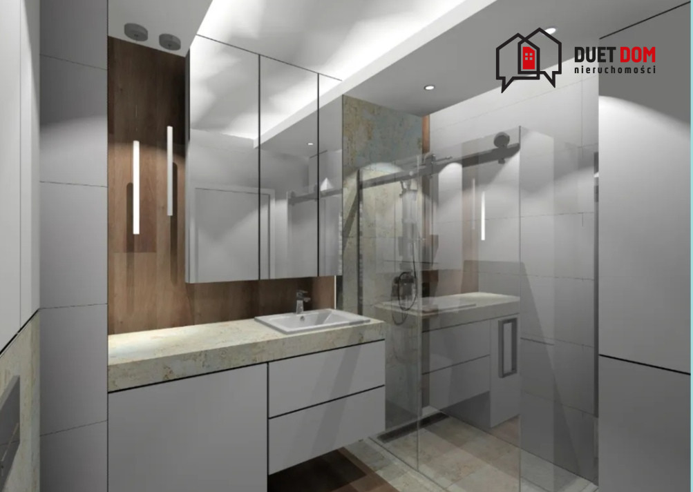 W łazience znajduje się wanna, natomiast właściciele pozostawiają nową kabinę prysznicową z odpływem liniowym - przyszły nabywca ma do wyboru montaż kabiny lub pozostawienie wanny, w zależności od własnych upodobań.